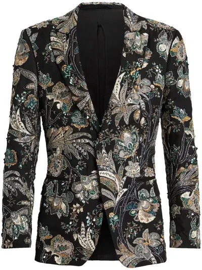 black/multicolour silk patterned jacquard all-over floral print peak lapels front button fastening long sleeves buttoned cuffs English rear vents