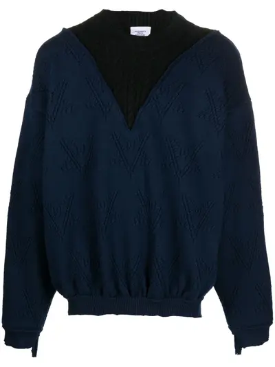 navy blue/black merino wool two-tone design embroidered design distressed effect crew neck drop shoulder long sleeves straight hem