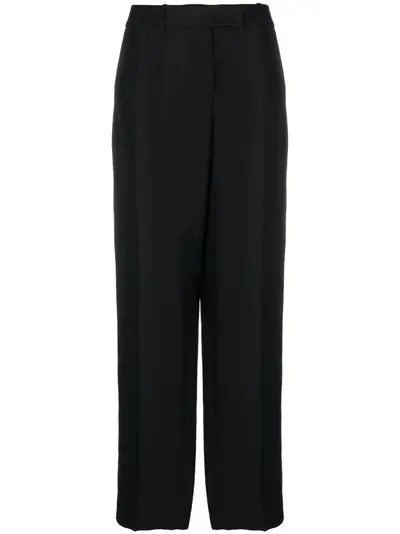 black tailored cut straight leg pressed crease mid-rise belt loops concealed front fastening two side slit pockets two rear jetted pockets