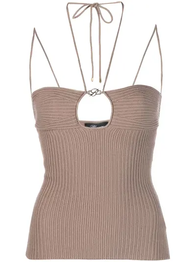 coffee brown ribbed knit cut-out detailing silver-tone logo plaque halterneck tie fastening spaghetti straps square open back straight hem