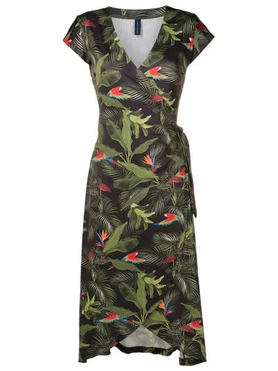 apple green/multicolour flared botanical print V-neck front tie fastening short sleeves mid-length