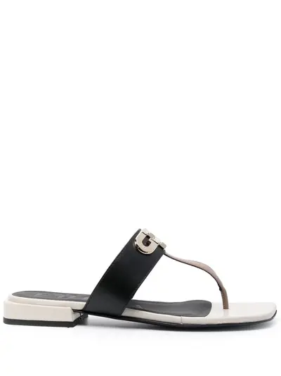 black/white leather gold-tone logo plaque open toe T-bar strap slip-on style branded insole flat rubber sole