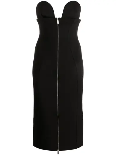 black stretch-design strapless sweetheart neck front two-way zip fastening silver-tone hardware calf-length straight hem