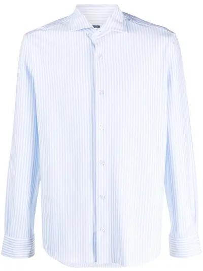 blue/white cotton blend vertical stripe pattern spread collar front button fastening long sleeves buttoned cuffs curved hem