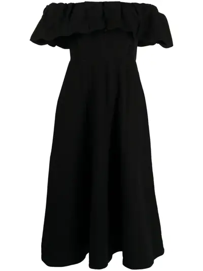 black cotton blend off-shoulder ruffle collar smocked panel fitted waistline flared skirt rear zip fastening scallop hem