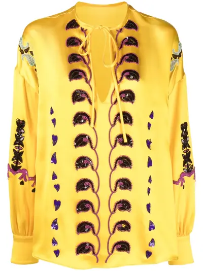 Valentino Ready To Wear yellow multicolour silk embroidered motif sequin embellishment round neck self-tie fastening bishop sleeves long sleeves