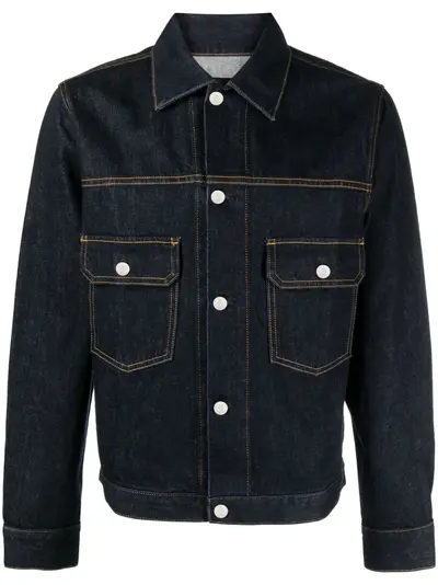 indigo blue cotton denim spread collar front button fastening two front flap pockets long sleeves buttoned cuffs straight hem