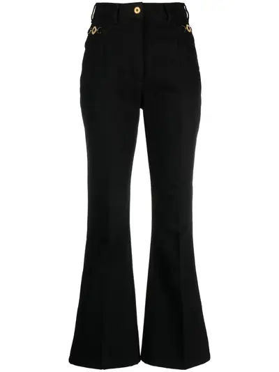 black cotton denim logo plaque gold-tone hardware pressed crease high waist belt loops front button and zip fastening slip pockets to the sides flared cuffs