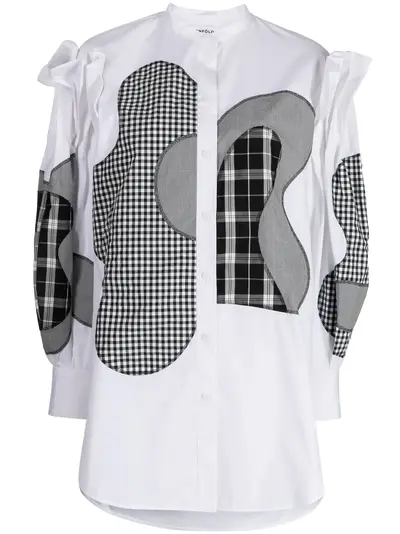 white/black linen-cotton blend patchwork detailing ruffled detailing band collar front button fastening long sleeves straight hem