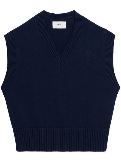 navy blue organic cotton-wool blend signature Ami de Coeur monogram motif knitted construction V-neck sleeveless ribbed hem When buying this unisex item, keep in mind that it is graded in standard men's sizing. Conscious: This item is made from at least 50% organic materials