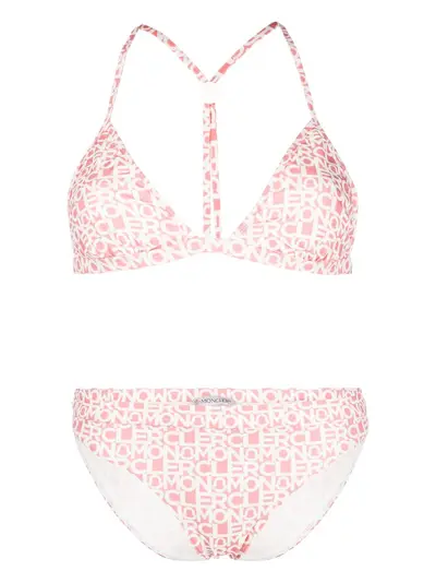 light pink/white all-over logo print halterneck triangle cup classic bottoms Be mindful to try on swimwear over your own garments.