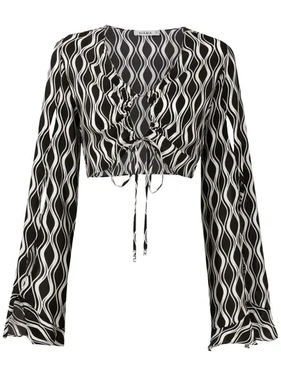 black/white silk all-over wave print cut-out detailing V-neck front tie fastening long bell sleeves ruffle cuffs cropped