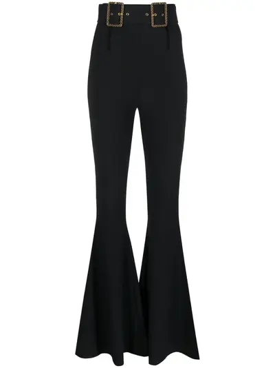 black high-rise waist double buckle belt two side inset pockets gold-tone hardware flared hems