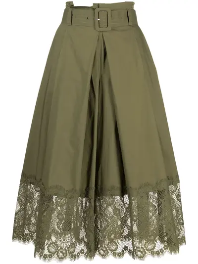 olive green cotton floral-lace detailing lace trim pleat detailing wide leg high-waisted belted waist belt loops side zip fastening scallop hem cropped leg