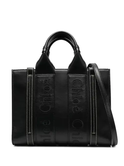black calf leather embroidered logo open top two top handles adjustable detachable shoulder strap main compartment internal logo patch