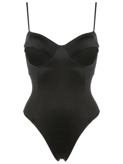 black stretch-design gold-tone hardware gold-tone logo plaque sweetheart neck adjustable spaghetti straps rear clasp fastening high cut Be mindful to try on swimwear over your own garments.
