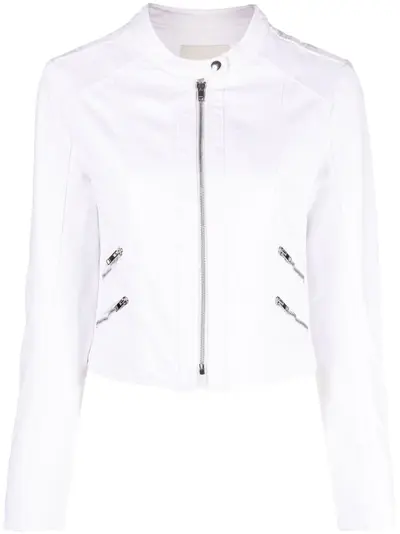 milk white cotton band collar front zip fastening front zip fastening pockets long sleeves straight hem