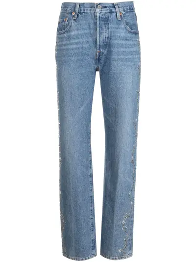 cobalt blue cotton washed denim whiskering effect logo patch to the rear seam detailing eyelet and Crystal embellishment tapered leg concealed fly and button fastening classic five pockets straight hem