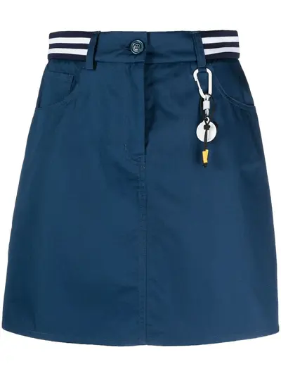 blue stretch-cotton A-line skirt stripe detailing button fly fastening belt loops classic five pockets