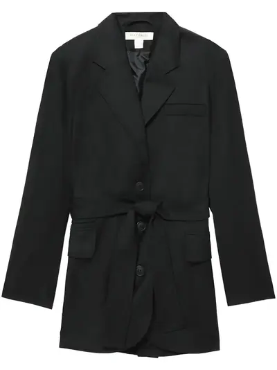 black wool blend belted waist front button fastening peak lapels chest welt pocket front flap pockets V-neck long sleeves