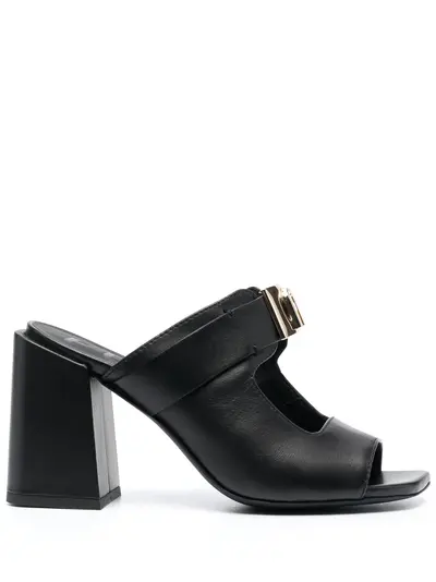 black gold-tone logo plaque cut-out detailing open toe square toe slip-on style branded footbed high block heel