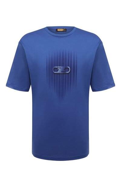 Синяя футболка с короткими рукавами и круглым вырезом на первый взгляд кажется шелковой. Такое впечатление производит мягкое гладкое джерси из мерсеризованного премиального хлопка, прошедшего специальную обработку. Спереди ‒ визуально объемный принт-логотип в такой же цветовой гамме.