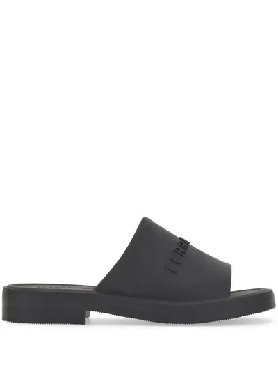 logo-embossed sandals from Ferragamo featuring black, embossed logo to the front, open toe, round toe, slip-on style, branded insole and flat rubber sole.