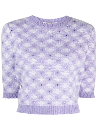 lilac purple white mohair-wool blend check pattern rhinestone embellishment crew neck half-length sleeves ribbed cuffs and hem diamond pattern