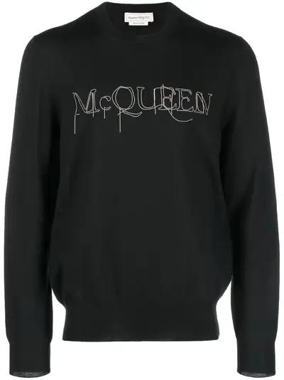 black wool fine knit ribbed trim embroidered logo crew neck long sleeves straight hem