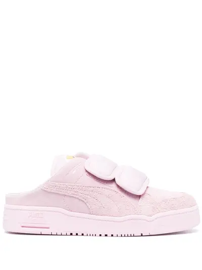 light pink suede contrasting panel detail slip-on style logo patch at the tongue perforated toebox open back round toe hook and loop fastening flat rubber sole