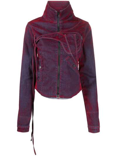 red cotton blend denim crossover strap detail high neck front zip fastening two side button-fastening pockets extra long sleeves curved hem black rubber logo patch to the rear