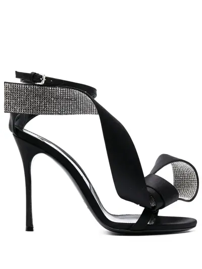 jet black calf leather oversize bow detail rhinestone embellishment branded leather insole open toe buckle-fastening ankle strap 105mm high heel