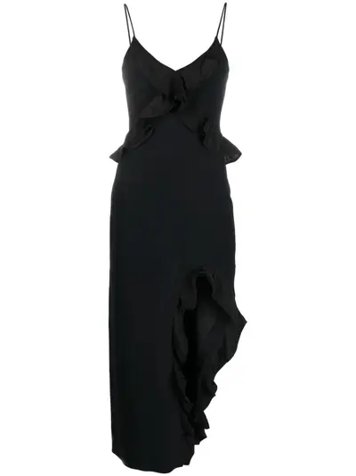 black V-neck spaghetti straps ruffled detailing rear zip fastening side slit mid-length asymmetric hem