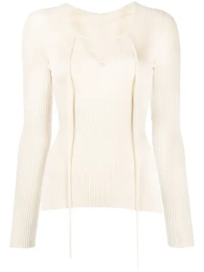 cream white cashmere-silk blend knitted construction fine knit ribbed knit V-neck front tie fastening long sleeves straight hem