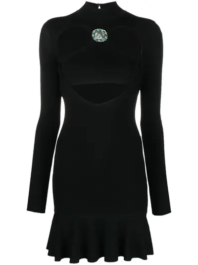 black brooch detail cut-out detailing bodycon design mock neck rear hook and eye fastening long sleeves ruffle hem above-knee length