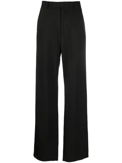 black cotton concealed fly and button fastening two side inset pockets rear jetted pocket rear flap pocket belt loops straight leg straight hem