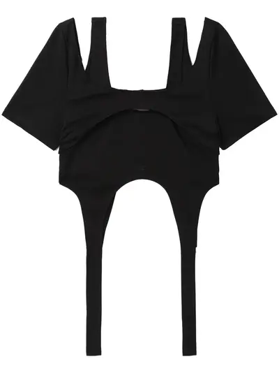 black stretch-design layered design cut-out detailing logo print to the front square neck square open back hook fastening short sleeves asymmetric hem