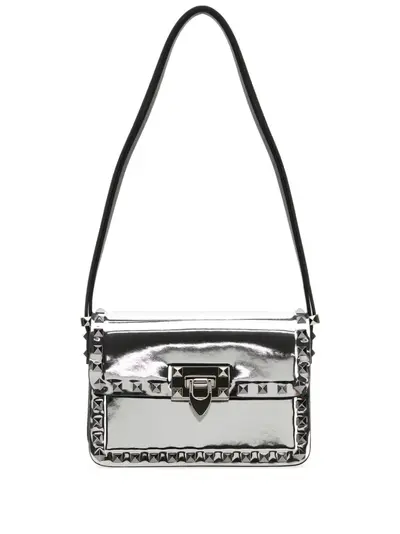 silver-tone leather mirror effect signature Rockstud detailing platinum-plated hardware adjustable shoulder strap foldover top hook fastening partitioned compartment internal slip pocket