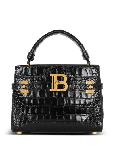 black leather embossed crocodile effect single rolled top handle signature B logo plaque gold-tone hardware main compartment internal slip pocket internal card slot adjustable detachable shoulder strap metal feet