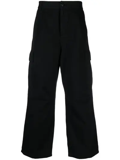 black organic cotton logo patch to the side belt loops front button and zip fastening two side inset pockets two side cargo pockets two rear flap pockets
