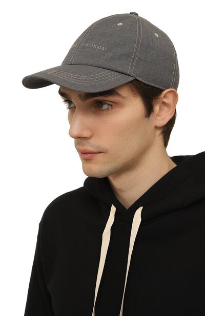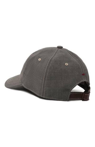 Серую бейсболку с широким изогнутым козырьком выполнили не из привычного хлопкового габардина, а из премиальной ткани Natural comfort из шерсти первого пострига, создающей комфортный для головы микроклимат в любое время года. Отрегулировать посадку аксессуара можно коричневым кожаным ремешком пряжкой. О принадлежности марке говорит небольшой логотип бренда, вышитый спереди.