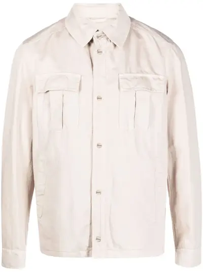 light beige cotton-linen blend two chest flap pockets two side slit pockets classic collar two chest flap pockets front button fastening long sleeves straight hem