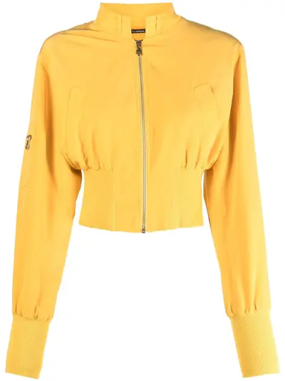 circa 2000s citron yellow silk blend high neck front zip fastening two side slit pockets long sleeves cuff zips sleeve zip pocket ribbed cuffs and hem Condition: GOOD. This previously owned and used item is in good condition with minimal signs of use. This may include fading of material or plating and scratches.