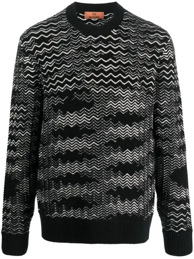 black/white wool blend signature zigzag woven design ribbed band collar long sleeves crew neck ribbed cuffs and hem The item you receive may differ slightly from the item photographed. This is due to the artisanal nature with which all Missoni products are constructed.