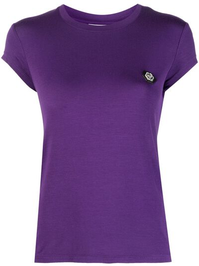 plum purple logo patch at the chest round neck cap sleeves straight hem