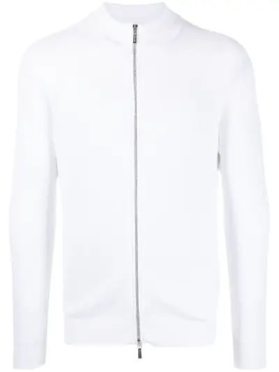 white cotton ribbed knit front two-way zip fastening long sleeves ribbed band collar ribbed cuffs and hem
