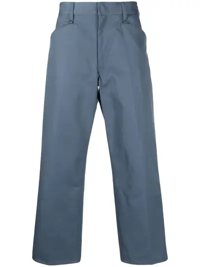 blue-grey logo patch to the rear concealed front button fastening cropped wide leg two rounded pockets to the sides two rear welt pockets