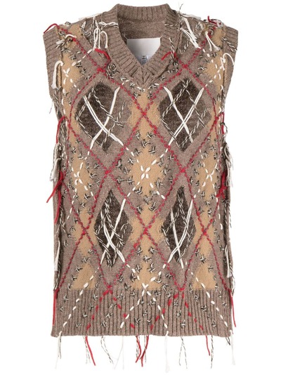 chamoisee/multicolour wool blend plaid check pattern frayed detailing side slits V-neck sleeveless ribbed cuffs straight hem ribbed hem