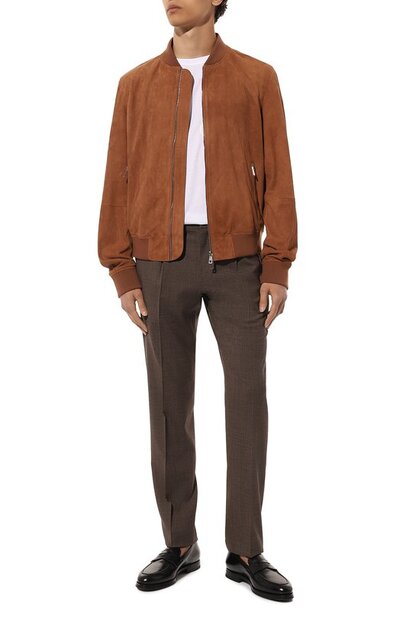 Прямые брюки с классической посадкой и заглаженными стрелками сшили из тонкой коричневой шерсти, на которой переплетение неравномерно окрашенных нитей образует микроузор. Пояс модели по бокам дополнили эластичными вставками, обеспечивающими идеальную посадку на талии. Наши стилисты рекомендуют дополнить изделие белой футболкой и замшевой курткой цвета охры.