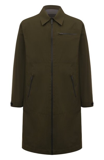 Плащ глубокого цвета хаки мастера марки выполнили из прочной мембранной ткани GORE-TEX, отталкивающей влагу и не пропускающей ветер. Снизу рукава дополнили ремешками с лентами велкро, которыми можно регулировать ширину манжет. Принадлежность изделия бренду обозначили красной полосой с белым логотипом. Сама модель, как и врезные карманы, застегивается водонепроницаемой молнией.